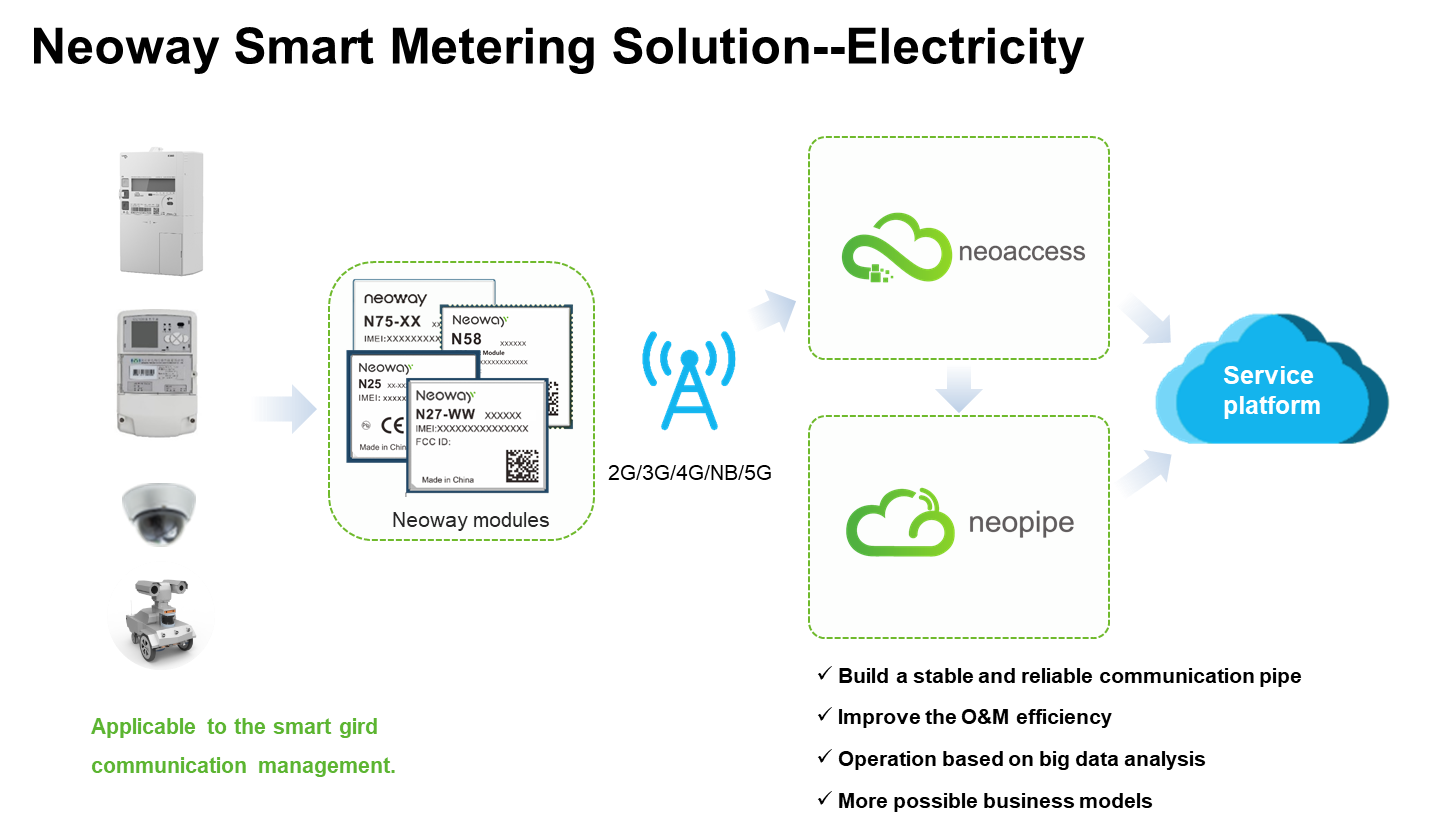 Neoway has been deeply engaged in the field of IoT communications for 16 years, and has rich experience and profound accumulation in the vertical field of power IoT. Since the beginning of the intelligentization of China's power industry in 2009, Neoway has grown and continued to lead the smart grid with stable and reliable innovative communications products. Neoway develops 2G, 3G, 4G, NB-IoT, Cat. 1, and 5G wireless communications products to provide stable and reliable access communications solutions for the intelligent and digitalized power grid in multiple links, such as power generation, transmission, distribution, and consumption. Since 2010, Neoway has remained the No.1 market share in the power IoT industry. As the power grid enters the 2.0 era and the global energy structure is continuously optimized, Neoway's cloud-pipe-device integrated access communications solutions have been applied to Europe, Southeast Asia, Africa, South America, the Middle East, and other regions. Neoway collaborates with customers to serve the power markets in many countries around the world.
