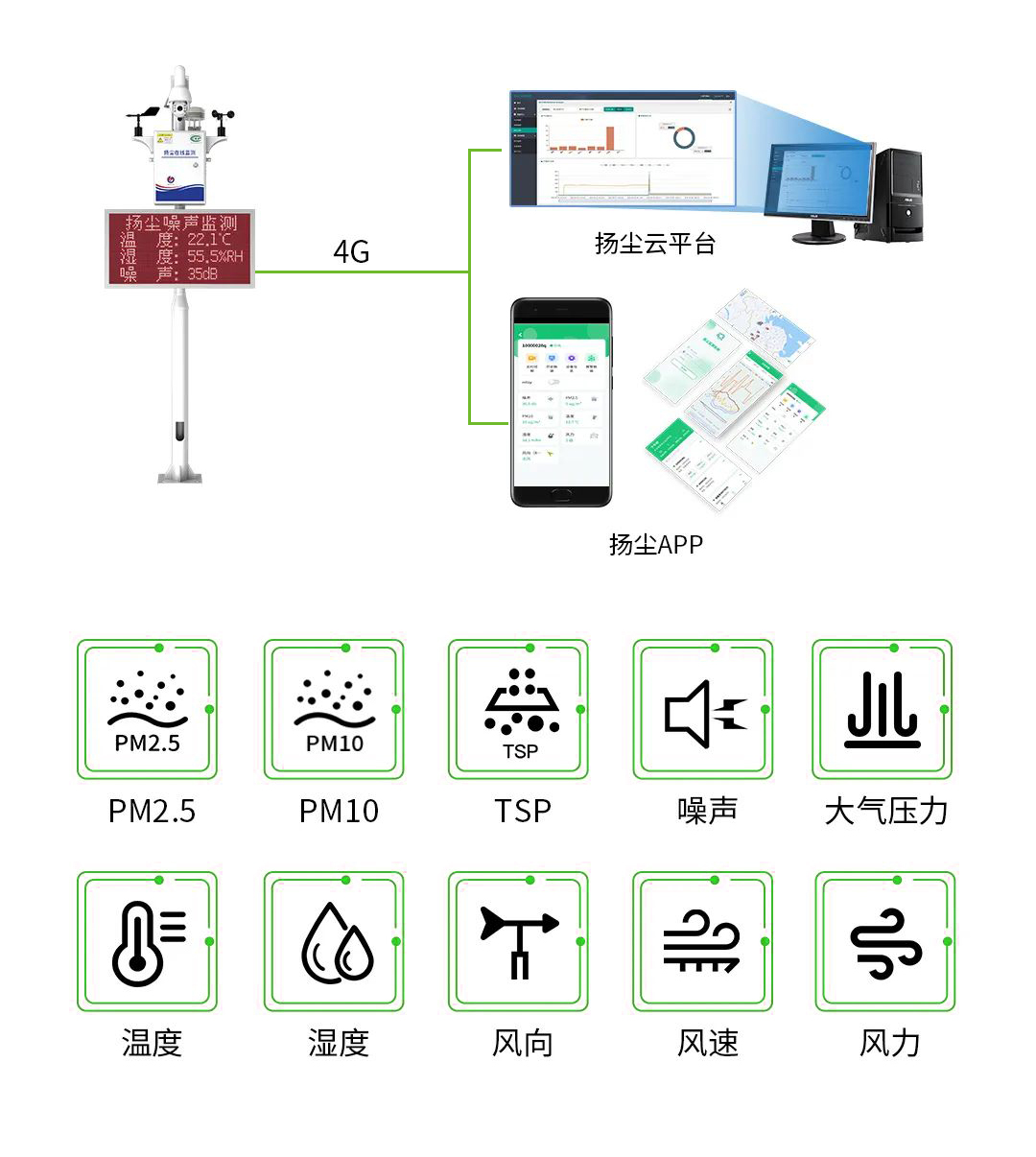 The dust monitoring system includes dust monitors, a cloud platform for dust data, and 4G voice alarm devices. It uses modern scientific methods to quantify and evaluate dust emissions objectively, scientifically, and accurately. This system is the preferred choice for monitoring dust emission concentrations at construction sites and large industrial and mining enterprises. It also serves as a crucial reference for environmental protection, construction, and municipal departments in assessing the control of airborne particulate matter emissions at their source.