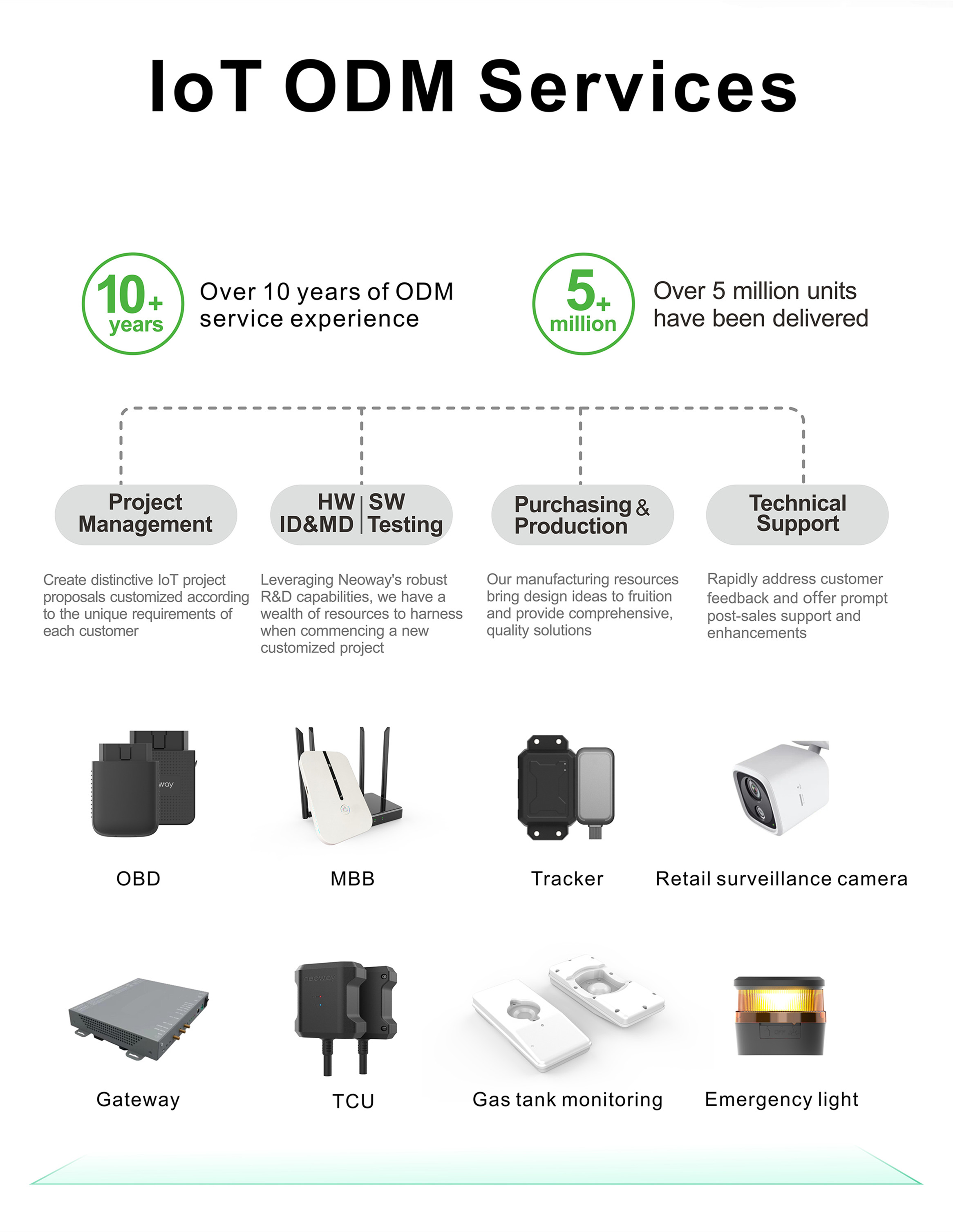 Neoway Technology has nearly 10 years of experience in terminal product ODM services, with over 5 million units supplied worldwide across various product categories, including OBD-II, MBB, trackers, retail cameras, smart gateways, TCUs, tank monitoring, and emergency vehicle lights.