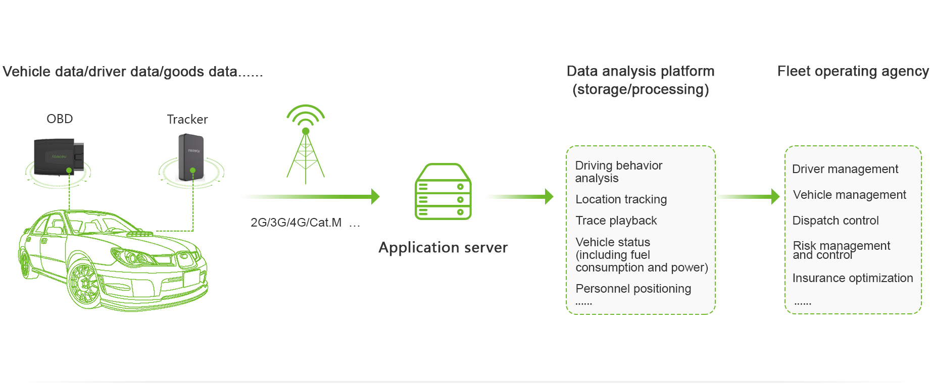 Before the vehicles are connected to the IoV, many problems exist in vehicle management. For example, the vehicle conditions cannot be grasped in real-time, the vehicle location cannot be monitored in real-time, and the driving route cannot be properly controlled. These fleet management problems now can be solved by the IoV solution. Neoway launches the in-vehicle OBD series products to solve the problems of fleet management.